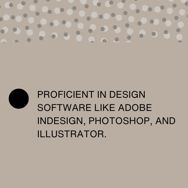 - Proficient in design software like Adobe InDesign, Photoshop, and Illustrator.